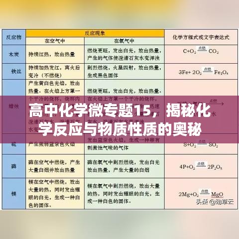 随着高中化学课程的深入,我们迎来了微专题15的学习,这一专题聚焦于化学反应与物质性质,旨在帮助我们更深入地理解化学世界的奥秘,本文将围绕这一主题,探讨其重要性、核心内容和实际应用。